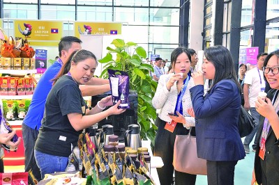 观众品尝老挝咖啡。杨逸夫摄/光明图片