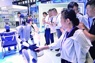 观众与科大讯飞展台的机器人握手。杨逸夫摄/光明图片